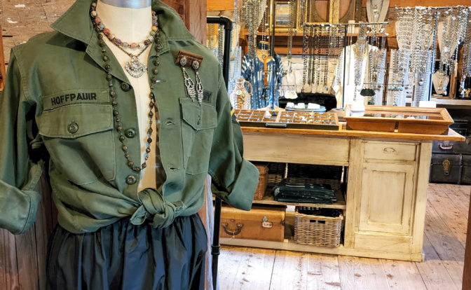The new showroom in Henkel Square is filled with unique jewelry and fashions in a log cabin-like setting.