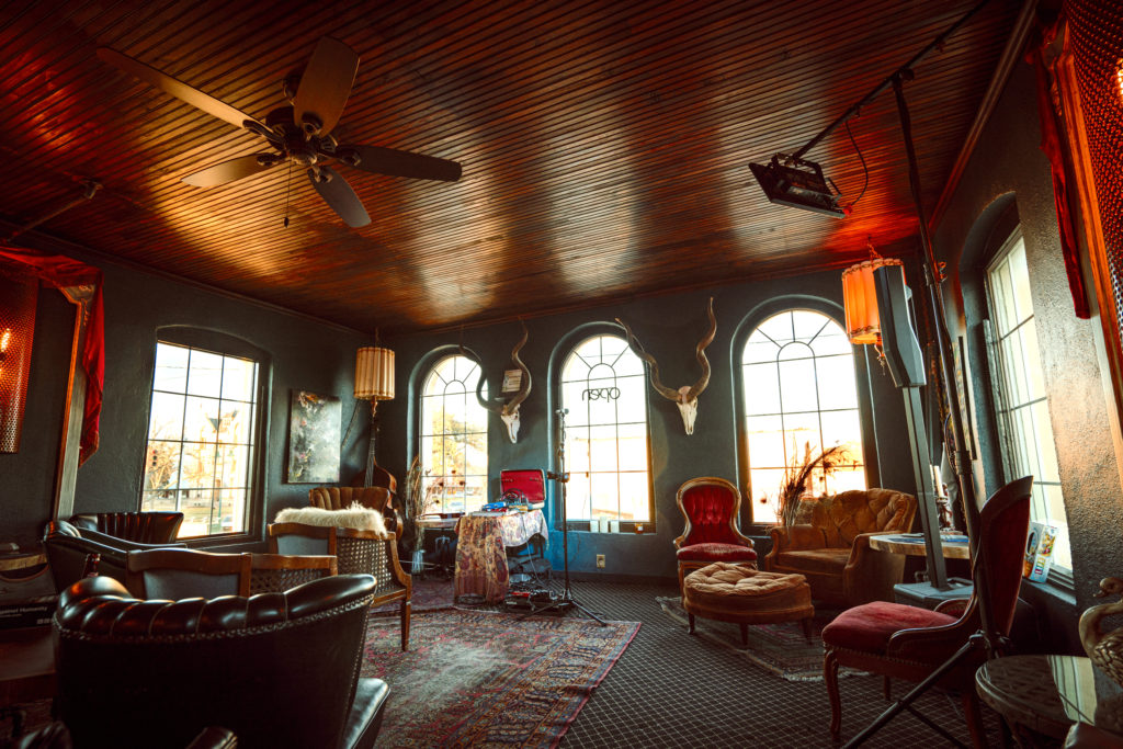 The second-floor lounge features rich, dark walls, posh carpets and a sophisticated mix of new, antique and vintage furnishings. Accented with live edge wood cocktail tables, exotic horn mounts and fur pelts, it oozes Prohibition Era speakeasy vibes. For Beth, decorating the bar was an opportunity to apply her aesthetic to a new space. Fans of her Dirty Bohemian clothing line will immediately recognize the similarities to her sartorial style. Although Weishuhn’s Dirty Bohemian storefront in Rolland Square (formerly known as Rummel Square) has permanently closed, her one-of-a-kind clothing pieces will still be available at Zapp Hall during the Round Top antiques shows and at pop-ups in between.
