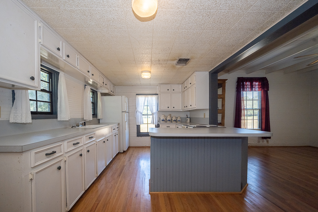 Oak flooring and original bead board ceilings and walls add vintage charm.