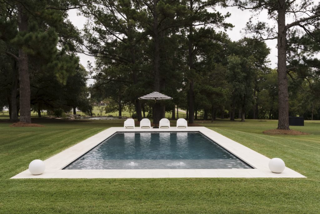 Classic design limestone-and-tile pool built by Shimmering Waters Pools, La Grange. IKEA chairs. Pottery Barn umbrella. (Photo Jack Thompson.)